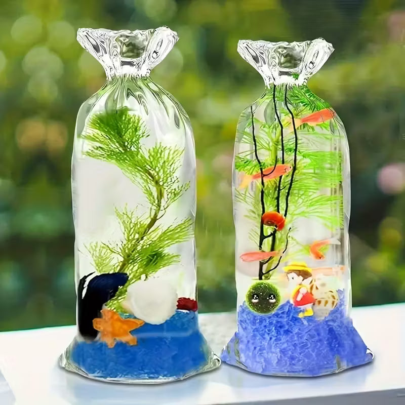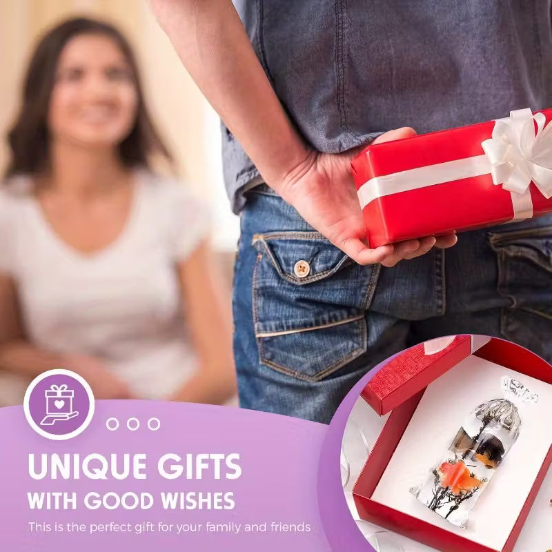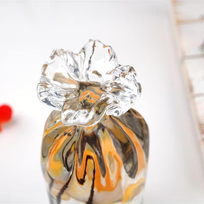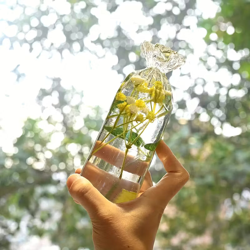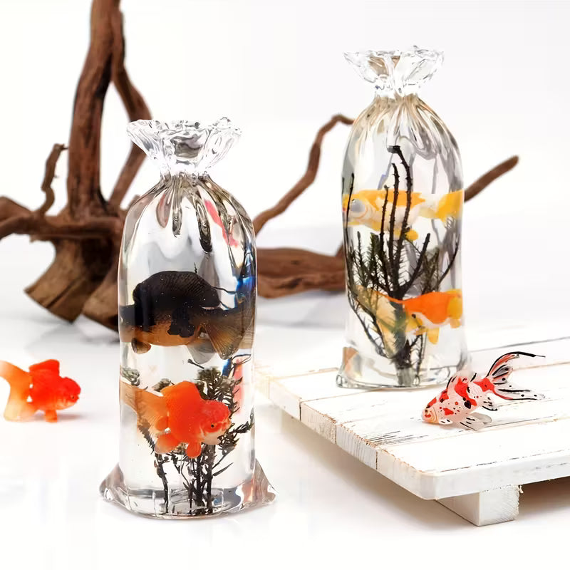 Chaque pièce contient un détail intérieur unique — une fleur, un poisson ou un petit élément décoratif — qui semble flotter librement à travers la transparence du matériau.