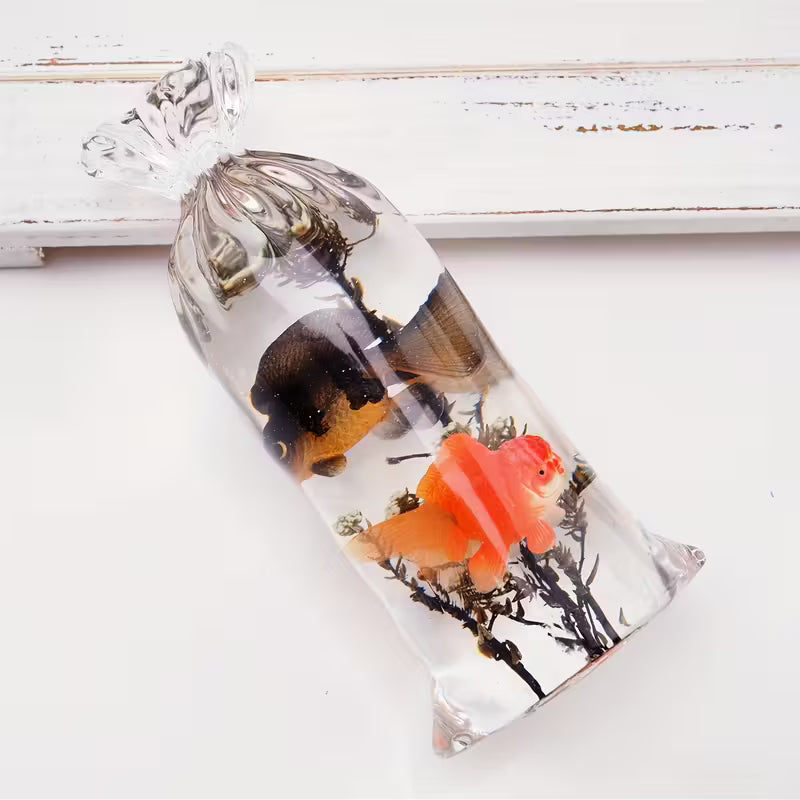 Coulé à la main dans une résine translucide de haute qualité, il reproduit avec finesse l’apparence d’un sac d’eau souple rempli et scellé, comme suspendu dans le temps.